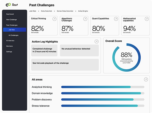 With our AI enabled tech, find the best candidate by leaderboard ranking, see how well they performed in each sub-category and get an understanding of how they think and will approach real world problems in the future.